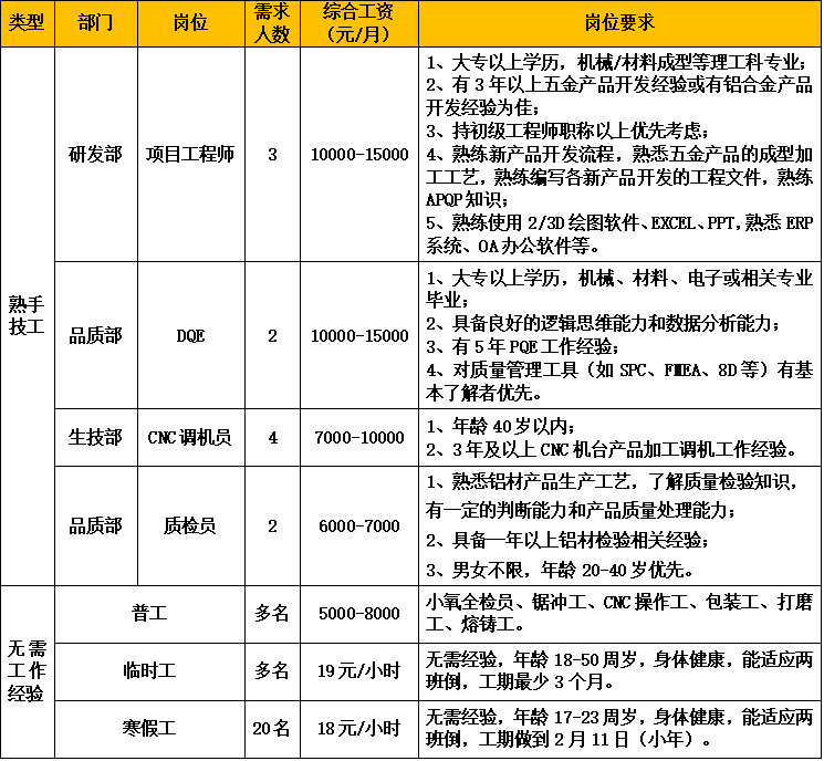 公司拥有广东省唯一的铝车体工程技术研究中心。“钛美铝材”品牌先后获得铝型材行业内的最高荣誉:“中国驰名商标”、“中国著名品牌”、“中国名优产品”;公司荣获“国家高新技术企业”、广东省“专精特新”企业等荣誉称号。因生产发展需要,诚聘以下岗位: