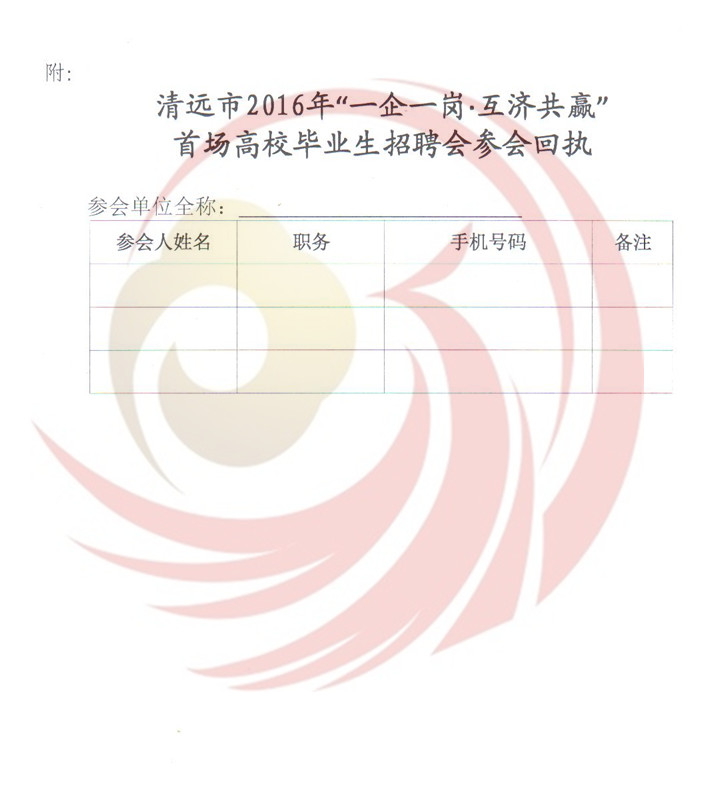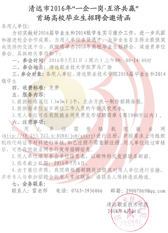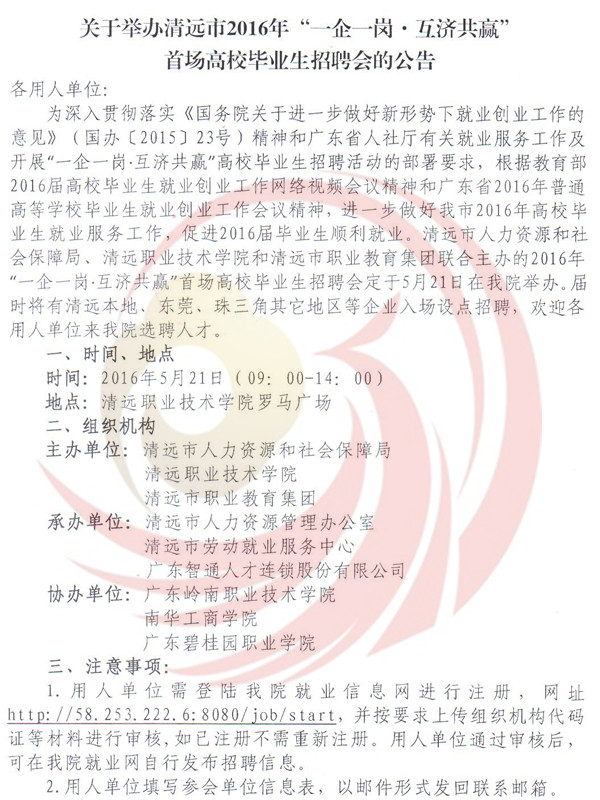 为深入贯彻落实《国务院关于进一步做好新形势下就业创业工作的意见》(国办﹝2015﹞23号)精神和广东省人社厅有关就业服务工作及开展“一企一岗▪互济共赢”高校毕业生找屁活动的部署要求,根据教育部2016届高校毕业生就业创业工作网络视频会议精神和广东省2016年普通高等学校毕业生就业创业工作会议精神,进一步做好我市2016年高校毕业生就业服务工作,促进2016届毕业生顺利就业。清远市人力资源四川和社会保障局,清远市职业技术学院和清远市职业教育集团联合主办的2016年“一企一岗▪互济共赢”首场高校毕业生招聘会定于5月21日在清远市职业技术学院举办,届时将有清远本地、东莞、珠三角其他地区等企业入场设点招聘,欢迎各用人单位到清远市职业技术学院选聘人才。
